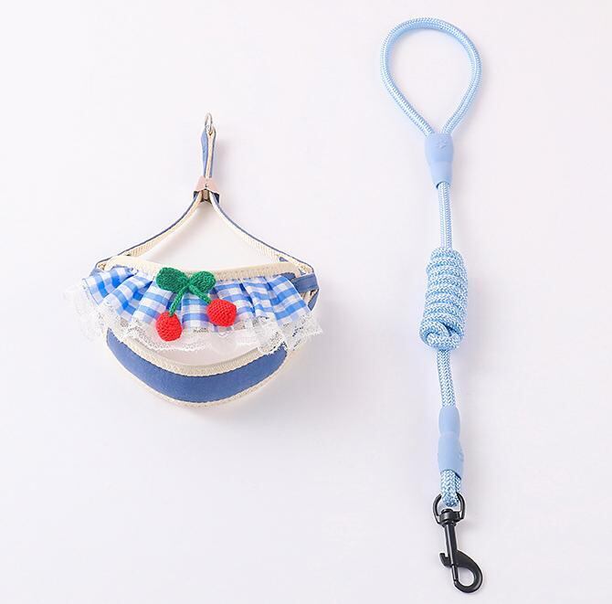 086 猫犬兼用 ハーネス&リードセット 可愛い格子×レース付き 胸当て式ペット用リード PS0086