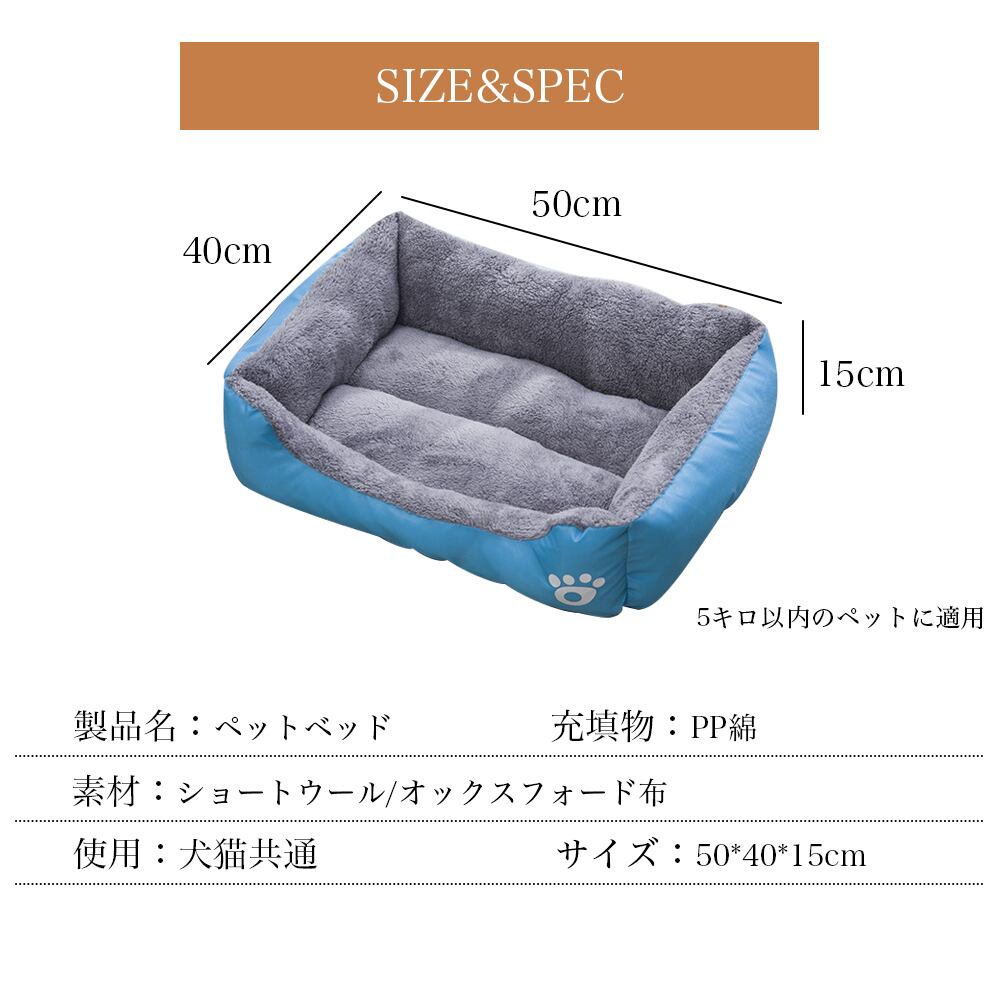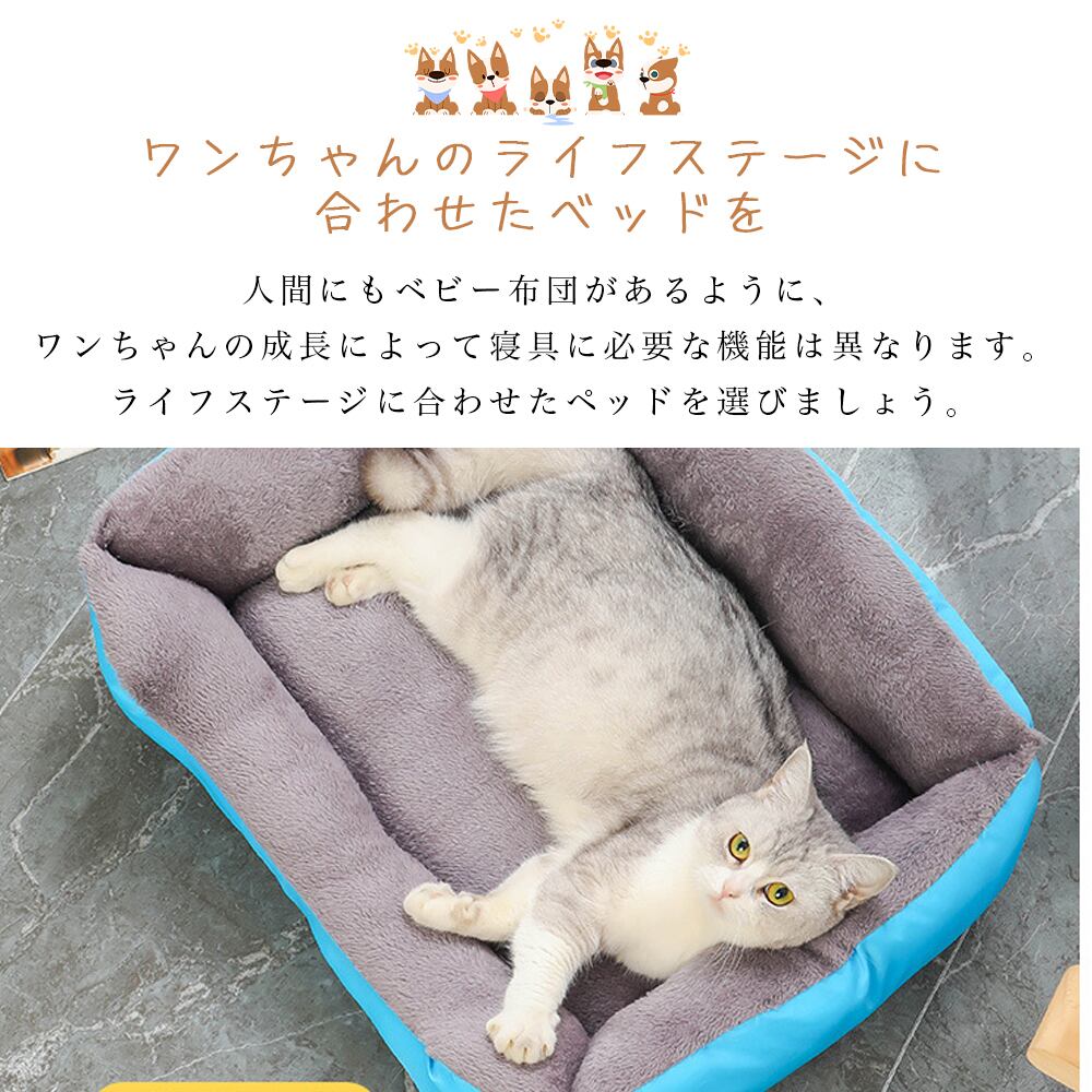 【こだわるデザイン】ワンちゃんもネコちゃんも使いやすいスクエア型のペットベッド。型崩れしにくいよう、高弾力性のポリエステル綿をたっぷり詰め込んでいます。そして、ペットは出入り安い間け口を仕上げています。線に高さがあるので、あご枕が好きなペットも大満足。
