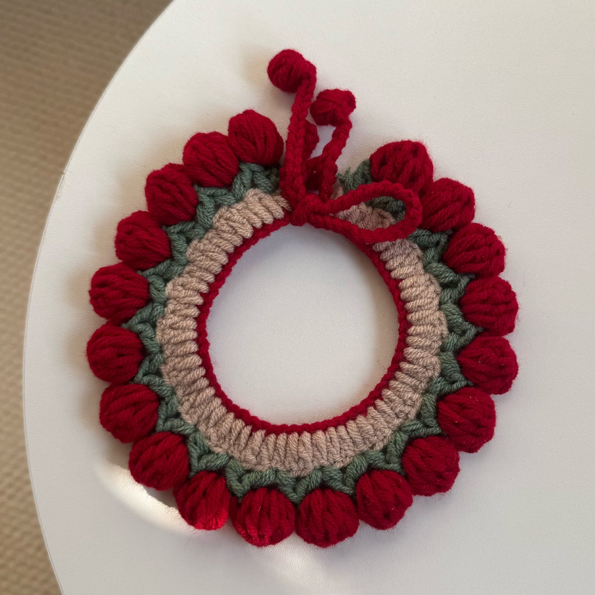 日常使いしやすいデザインに仕上げた、手編みニットの囲い襟スタイです。