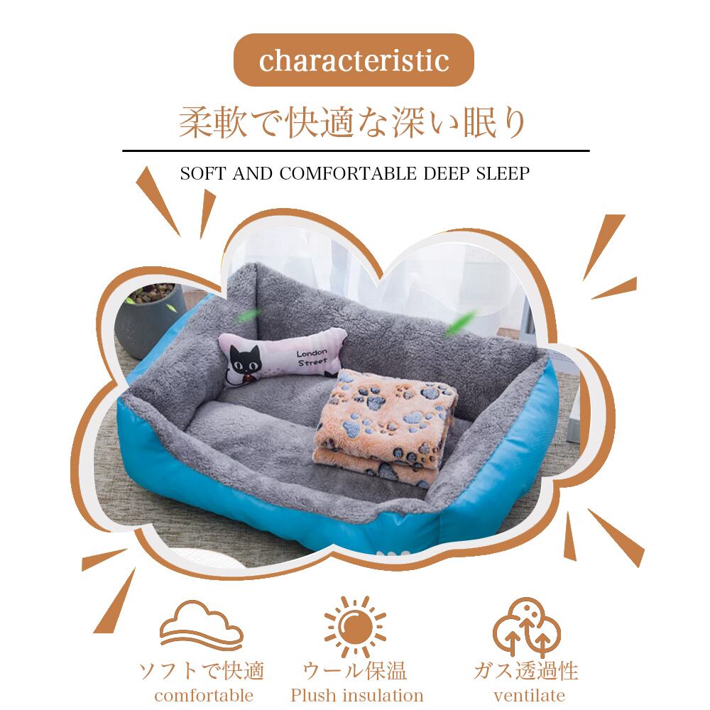 【こだわるデザイン】 ワンちゃんもネコちゃんも使いやすいスクエア型のペットベッド。型崩れしにくいよう、高弾力性のポリエステル綿をたっぷり詰め込んでいます。そして、ペットは出入り安い開け口を仕上げています。縁に高さがあるので、あご枕が好きなペットも大満足。