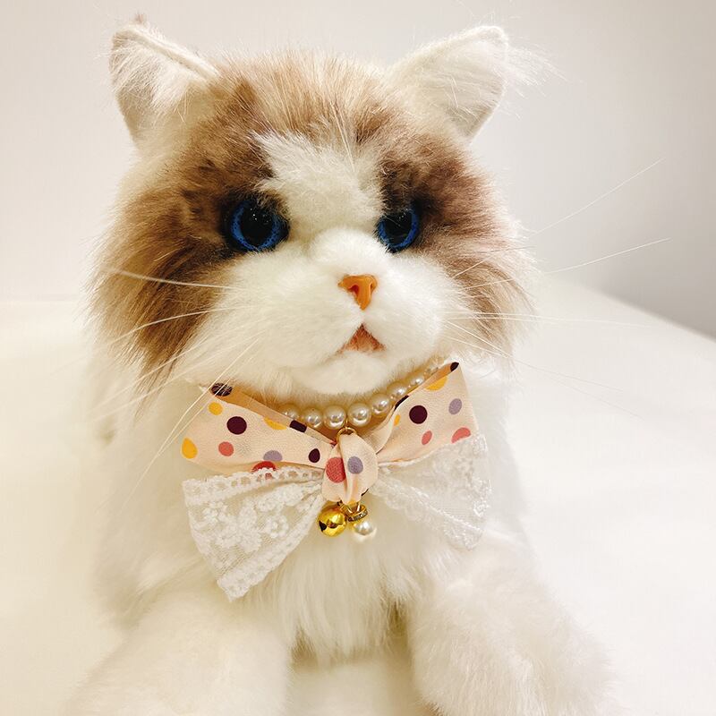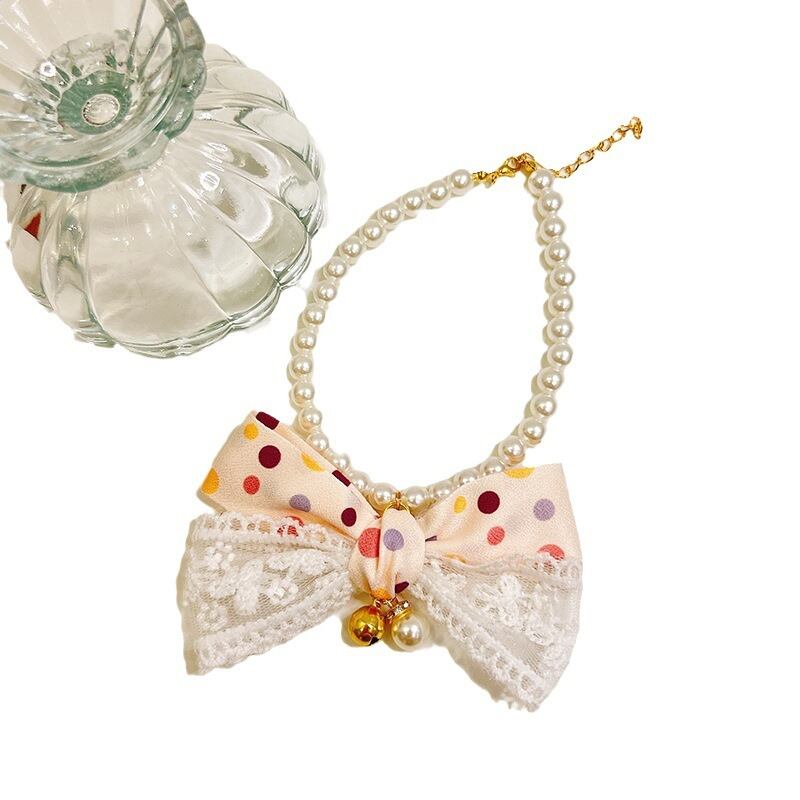 スイートな水玉レース 猫用パールネックレス 可愛いペット用首輪 蝶ネクタイ風 犬用おしゃれ首飾り C0009